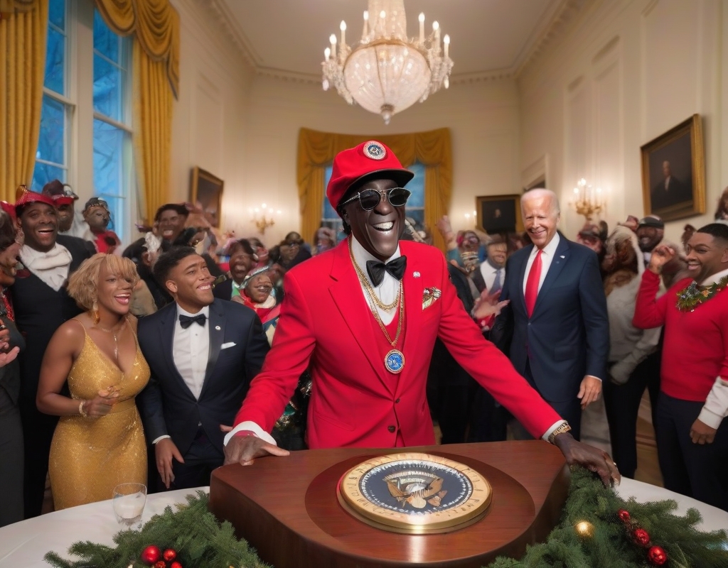 In an unforgettable installment of the White House Christmas party under President Joe Biden’s leadership, Flavor Flav, the famed rap icon, brought an electrifying atmosphere to the stately event. Dressed in his characteristic bright red outfit coupled with his trademark large clock necklace, Flavor Flav infused the evening with his distinctive charm and high-energy persona, making the occasion a night to be remembered.