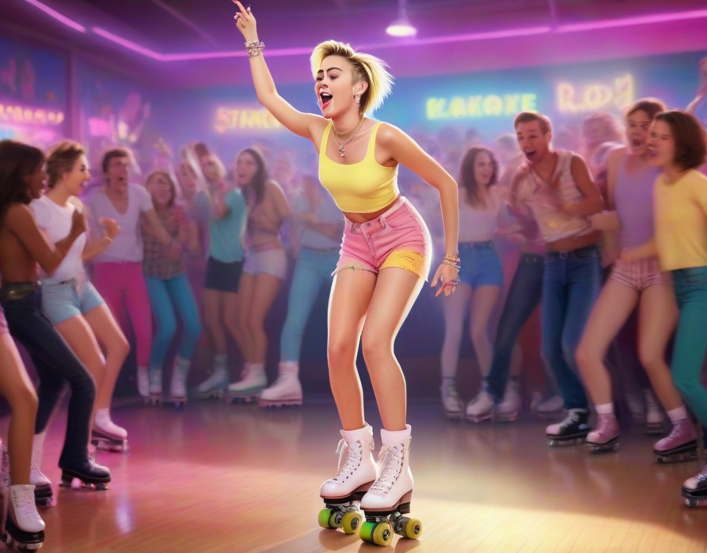 In the rapidly developing cityscape, Miley Cyrus was spotted thoroughly enjoying herself during a lively outing at the highly regarded ROLLER RINK, engaging in both roller skating and belting out karaoke classics. She skillfully managed her time between the two activities, showcasing her talents and vibrant personality.