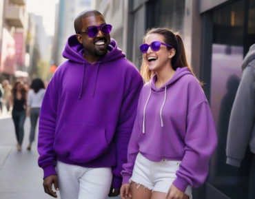Kanye West makes headlines wearing a striking purple hoodie alongside a mystery woman in recent outing.