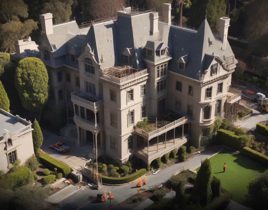 Recent updates reveal a large-scale renovation project in progress, with the entire exterior of the mansion surrounded by scaffolding. The gardens, once verdant and blooming, now host a collection of construction gear and materials, as numerous workers labor to update the estate for modern living.